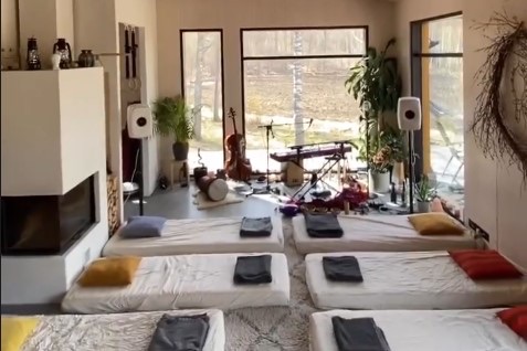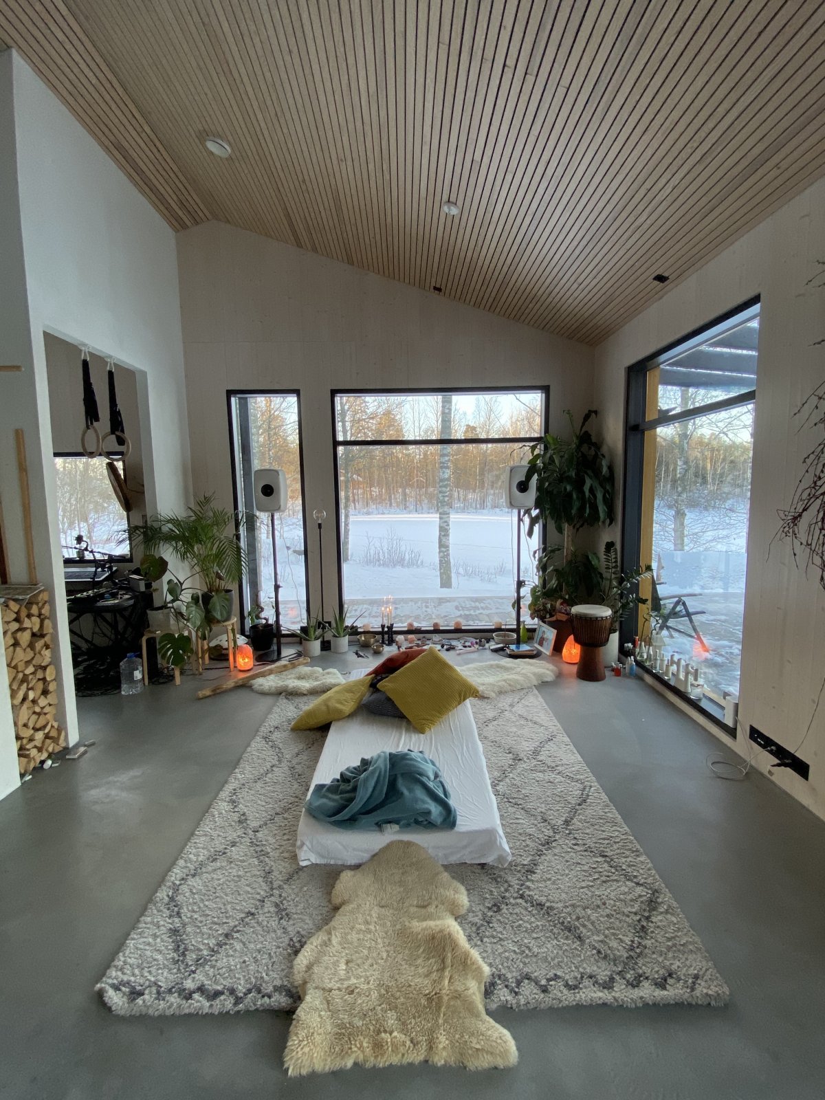 The total space of approx. 60 m2 (with the recessed studio room) can seat (e.g. at a temporary concert, with seat cushions on the floor) a max. of 30 people. For events requiring more space for each person (e.g. yoga or sound journey) approx. 12 people can be accommodated.